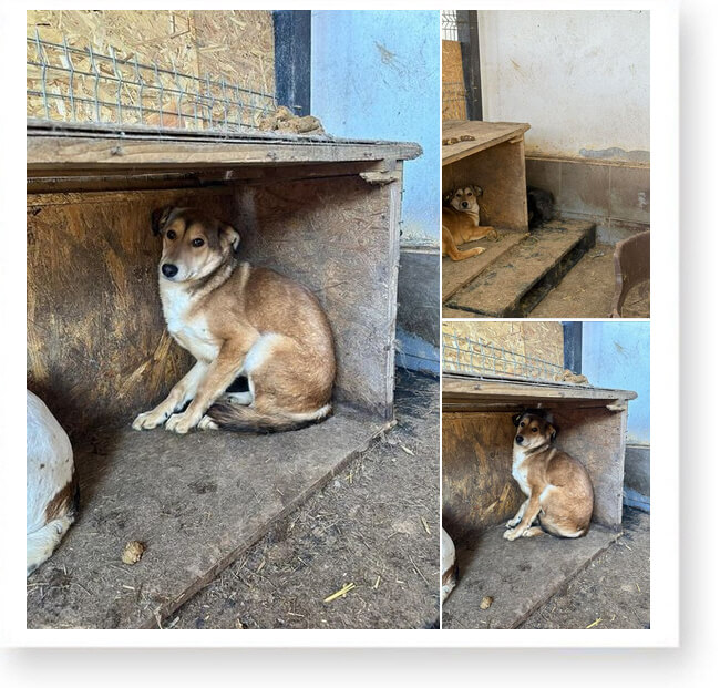 Er traut sich kaum dort raus, das shelter macht ihm Angst. Er ist einer von den sensibleren Hunden, der Krach, das Bellen den ganzen Tag, das macht ihm zu schaffen!!!